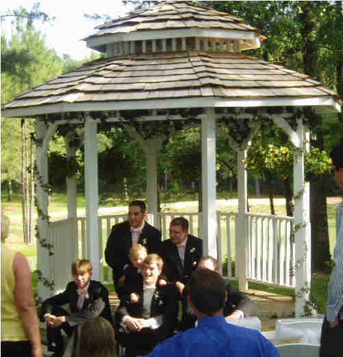 Nick built the gazebo. It has a fan in the top. The property has a pond behind the gazebo and a huge white tent was set up for the reception.
