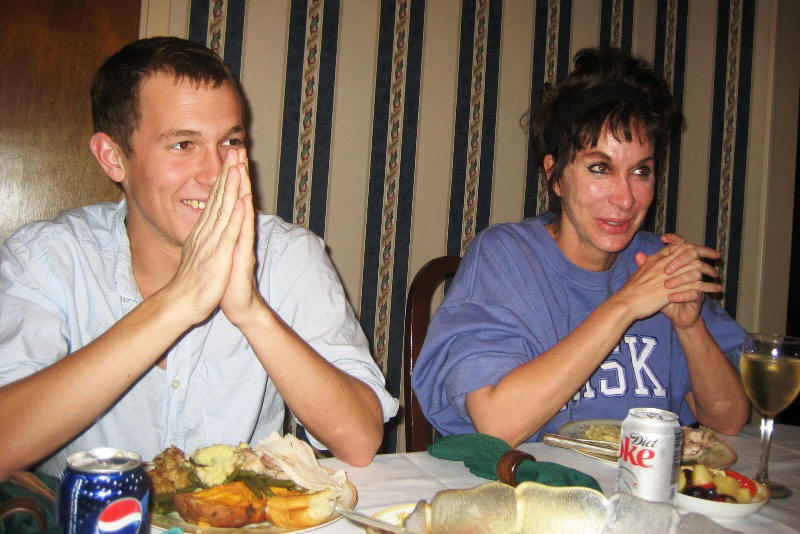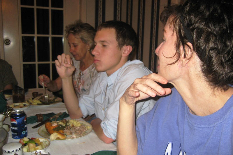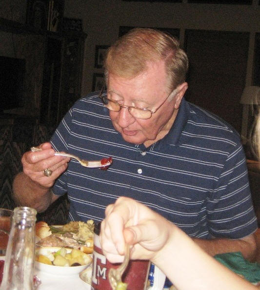 John (Papa) is at the head of the table and eating his beloved cranberry sauce.