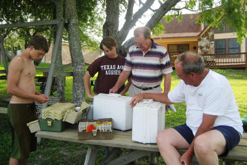John shows Patrick, Tim and Jay his fishing lures. Some are almost antique! Since Tim now has a boat (thanks to nephew Austin), he enjoys fishing when he can.