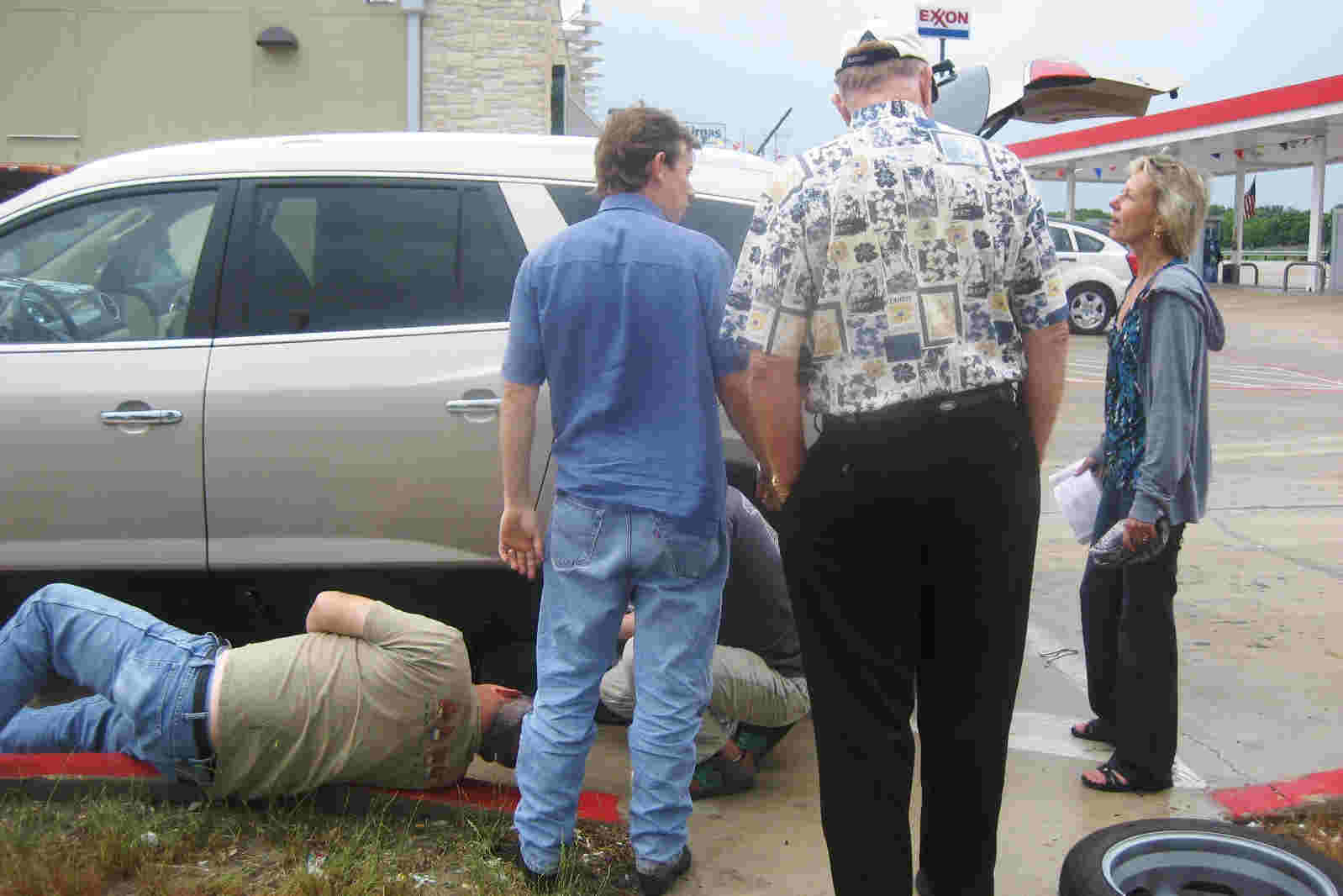 A nail in the tire of the McGovern's brand new Buick Enclave causes a 3 hour delay. Here are 4 Aggies and a "soon to be" UT freshman trying to figure out how to get the jack to work so the tire could be changed. Jay is laying down checking the spot under the car. Patrick is squatting down, Tim, John and Elizabeth are standing. Nancy, Joe and Schnitzel (Joe's dog) are staying out of the way.