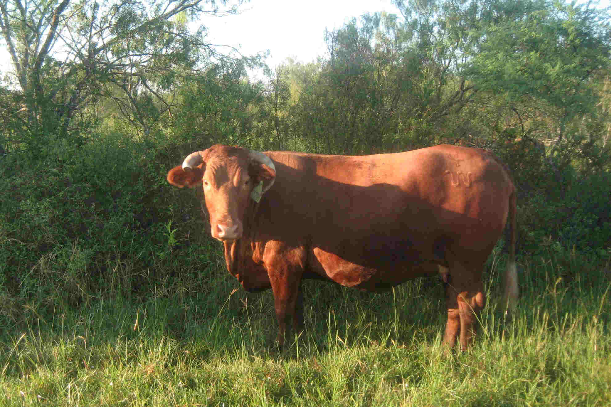 This cow has the right horn snipped. The "rolling W" brand is seen on his rear and the date the cow was born is branded above.