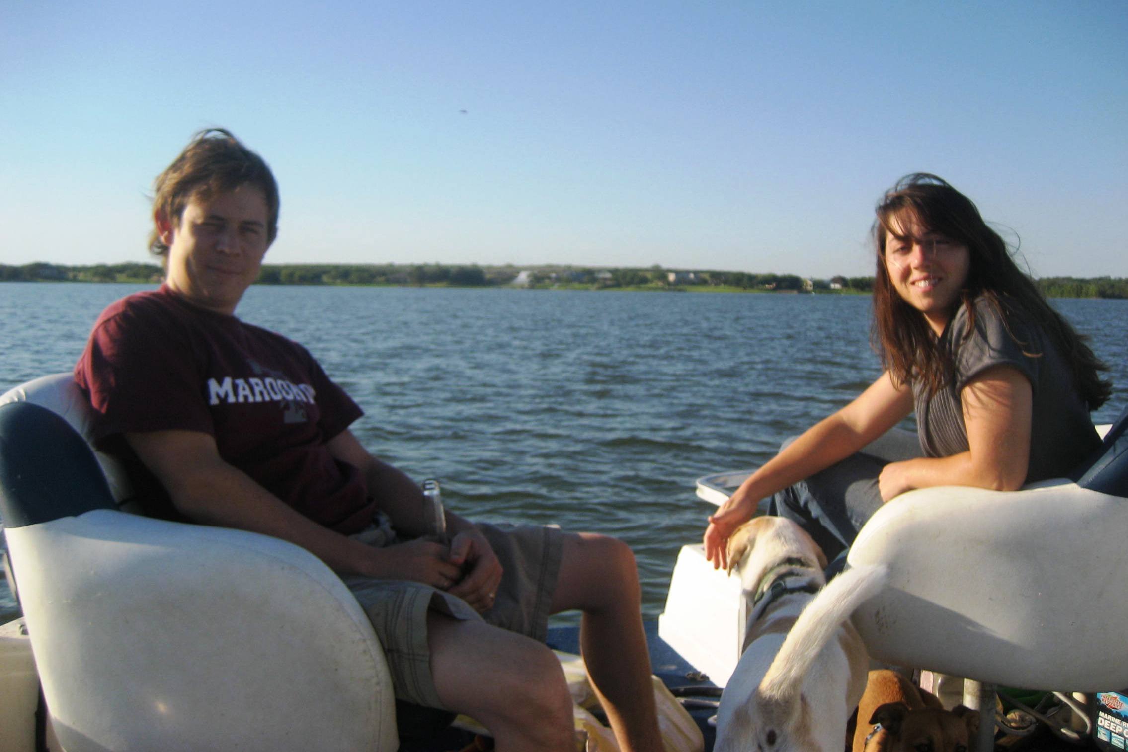 Jay and Elizabeth with Baxter, fondly known by her as "Sweet Pea" enjoy a pontoon boat ride.