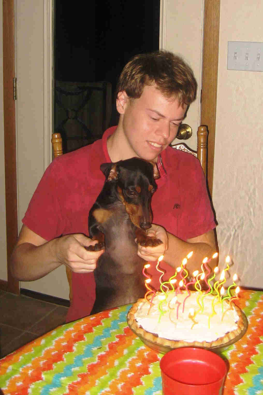 Joe has a chocolate pie for his birthday. We are all thrilled because Elizabeth makes the best chocolate pie around. His dog Snitzel helps him blow out the curly candles.