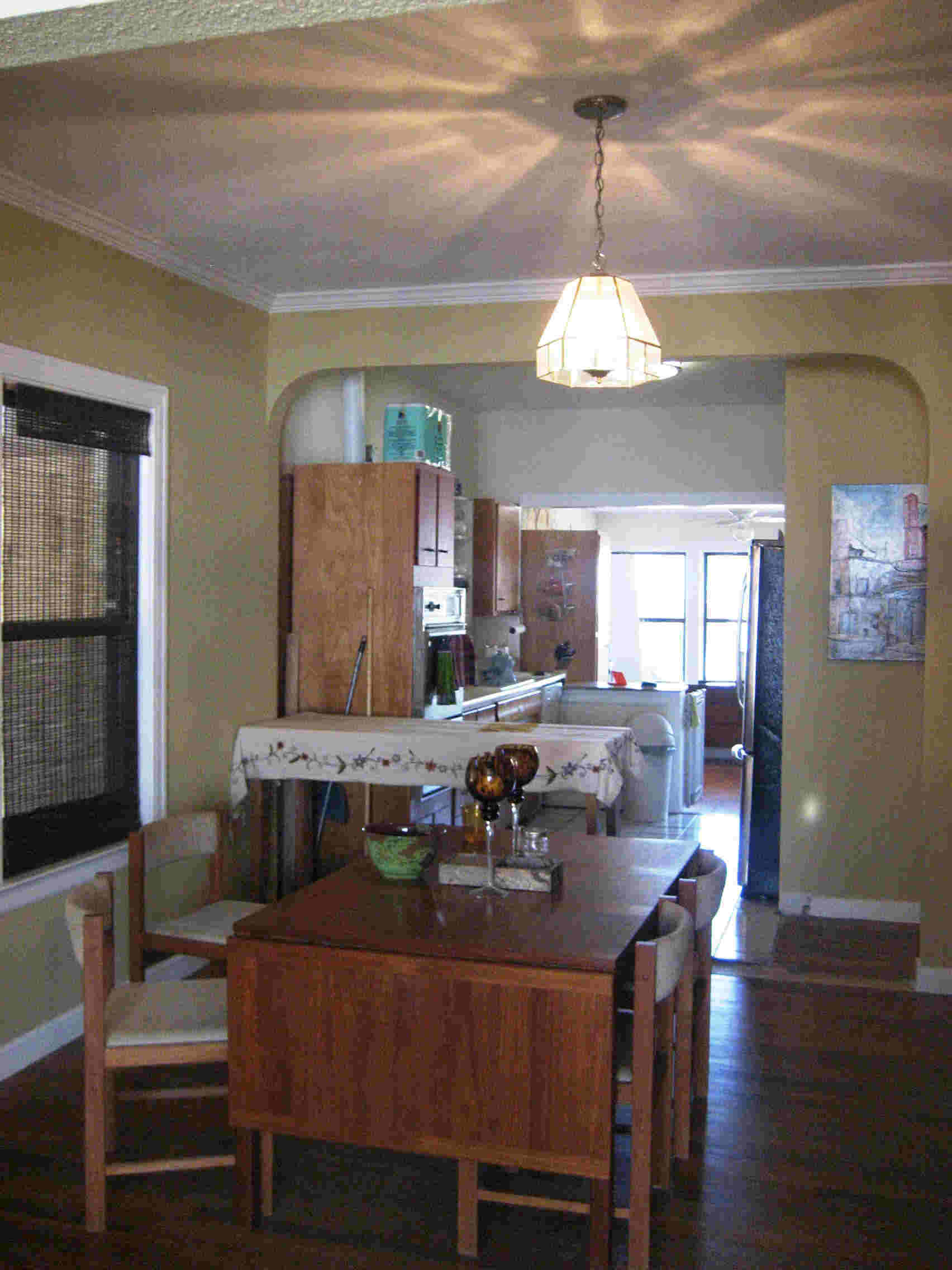 Their Dining Room with sponged painted walls and animal hanging that Chelsea got in Europe on her first trip and an antique baby high chair they bought at a garage sale.