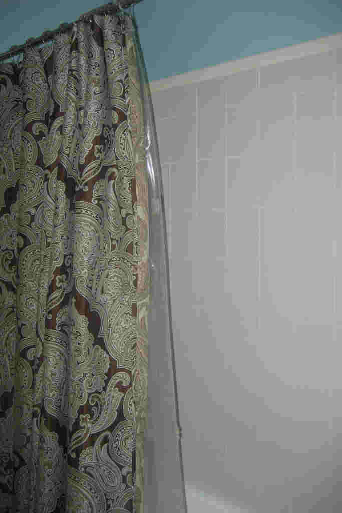 The original sink has new fixtures, the wall tile is painted white and walls are now blue.