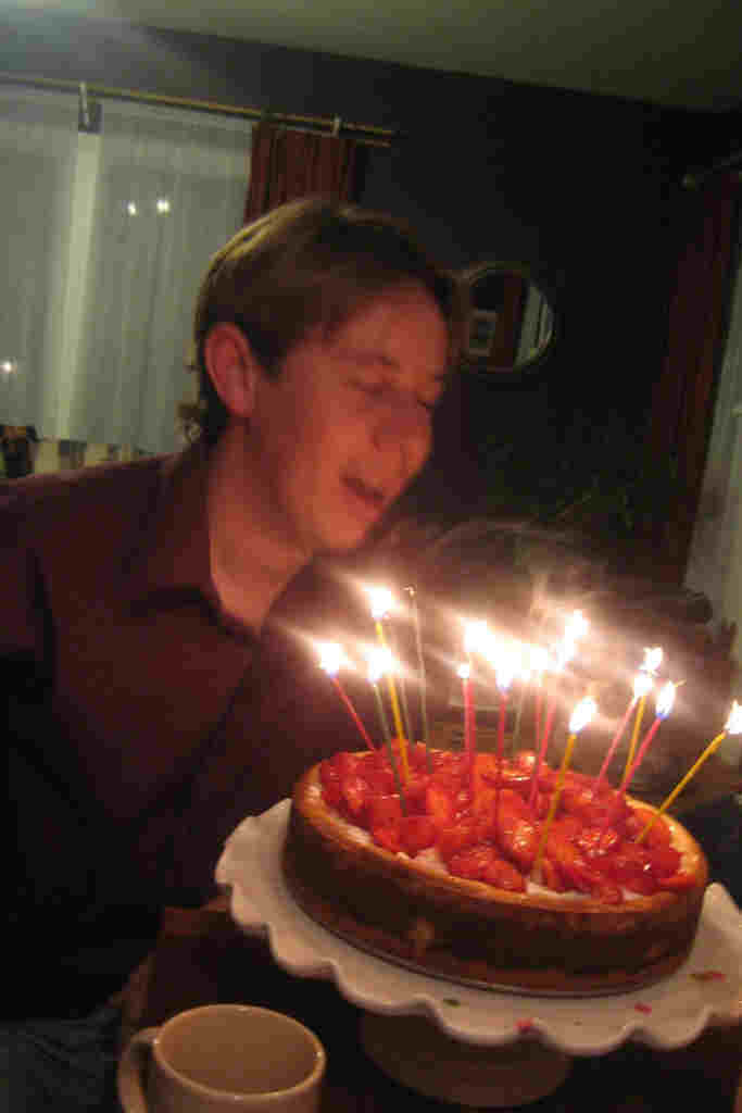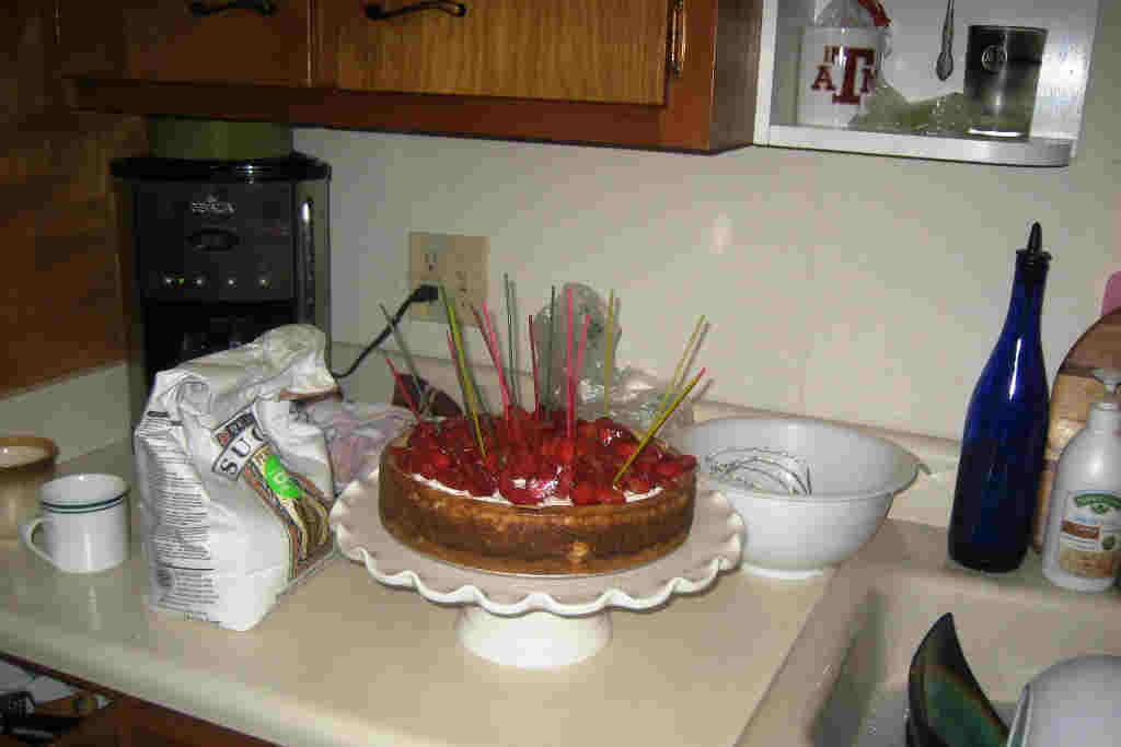 Chelsea makes Tim a Strawberry Cheesecake with 25 sparkling candles.