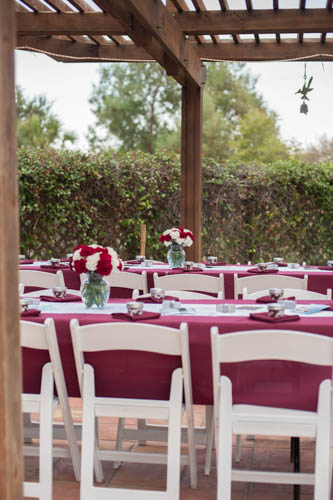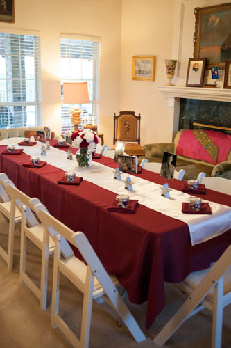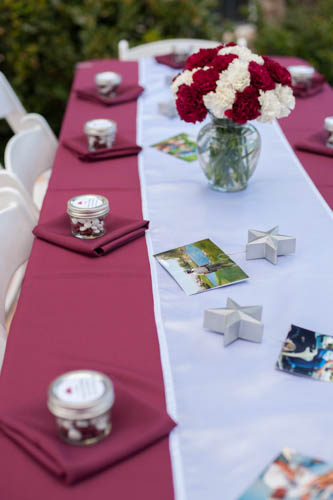 Elizabeth, with designs from Deb and help from Susie, provided the decorations. We had tables outside on the gazebo, in the Entrance Hall, Living Room, Dining Room and Breakfast Room. There were enough seats for the crowd. The decorations are maroon table clothes and napkins with white runner, maroon and white carnations, favors of maroon and white M & M's in jars and pictures of John's life held by silver stars on every table. Each table had a special theme of his life while the TV had a running slide show.