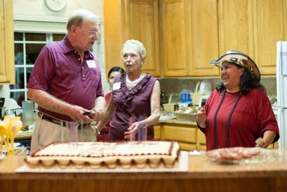 John is ready to cut his Aggie cake as Nancy and Elsa give instructions.