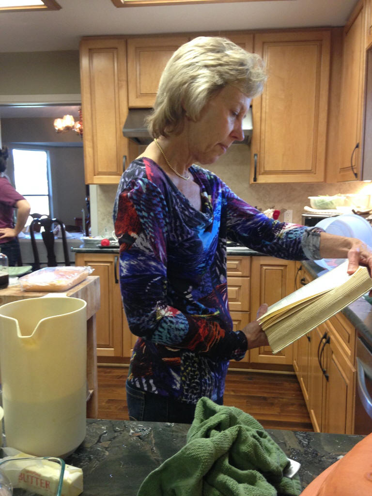 Chef Elizabeth studies the cookbook. Chef and Sous-Chef Chelsea wonder why the turkey in so brown on top. (A secret!)