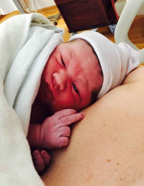 After 12 hours of labor, Chelsea had an almost 9 pounds boy ... all natural. Chelsea eats a healthy meal, while Tim grins. Proud parents!