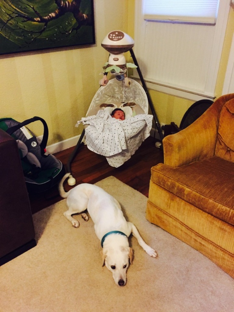 We all worried that their dog, Coco, would hurt the baby. Instead, he has appointed himself the guard dog. Conlan is now 4 days old. Tim wants him to get used to the outside nightly fire pit.