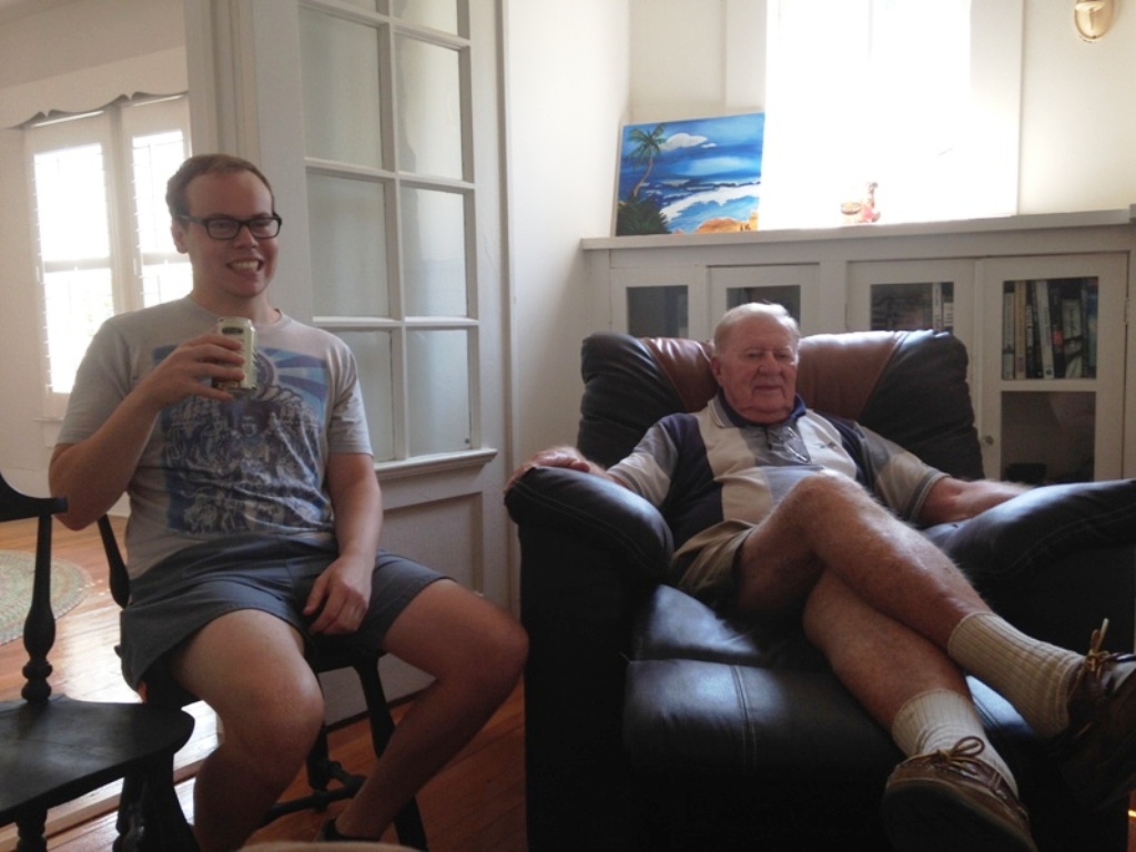 Amy (Joe's girlfriend) and Grandpa Jay hold Conlan.
