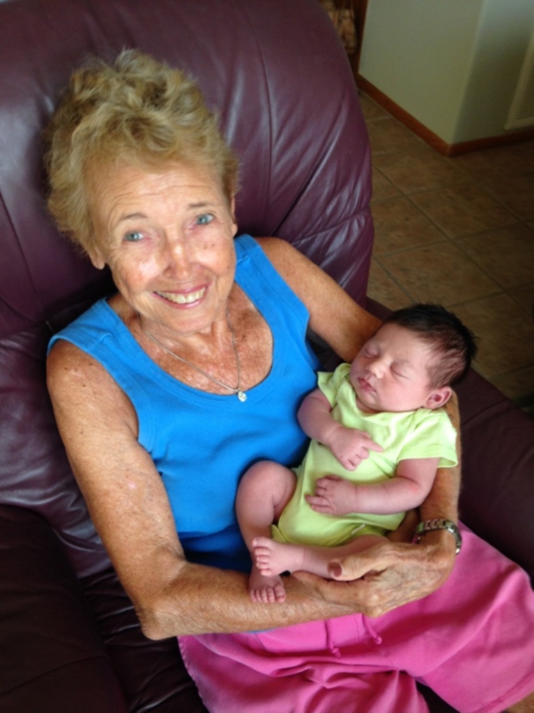 Nanny gives the camera to someone else so she can hold her first great grandson.